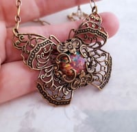 Hand crafted glass fire opal monarch butterfly necklace with enchanting lace like filigree wings. Victorian, Art Nouveau influence.