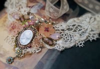 Romantic frosted glass cameo with lavishly adorned beaded embroidery which includes Czech glass opals, glass beads, flowers and vintage Swarovski crystals on Ivory cream lace that will get many compliments.