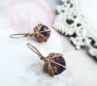 Art Deco style dragonfly earrings, hand crafted artisan jewelry. Medium sized dragonfly earrings with brilliant Czech glass jewels that pick up a multitude of colors, mainly in violet shades.